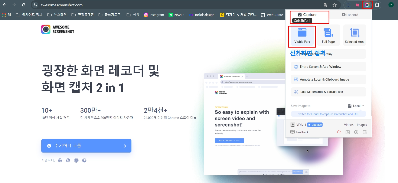 브라우저 우측 상단에 Awesome Screenshot 아이콘 클릭하고 캡처 옵션 선택 Visible Part(화면 전체), Full Page(스크롤 전체 페이지), Selected Area 사용자 특정 영역) 중 하나를 선택합니다.