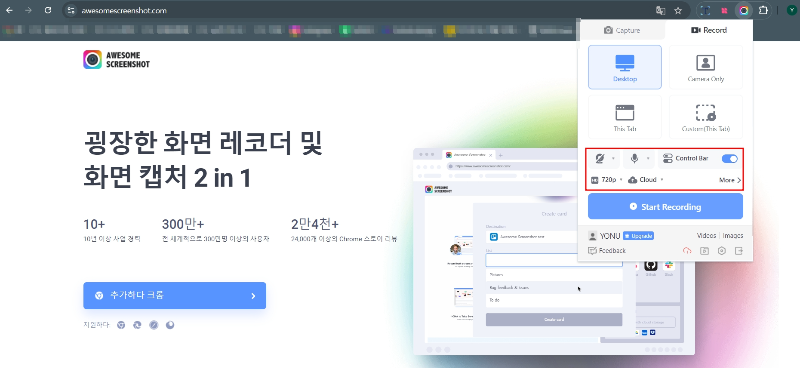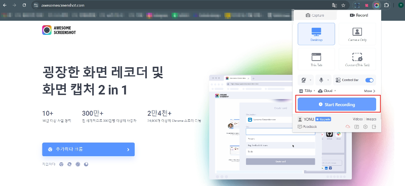 브라우저 우측 상단에 Awesome Screenshot 아이콘 클릭하고, 화면 녹화 모드 Decktop(전체화면녹화), Camera Only(개인 화면 녹화), This Tab(현재 사용 중인 브라우저 탭만 녹화), Custom(특정 영역 녹화) 중 하나를 선택합니다