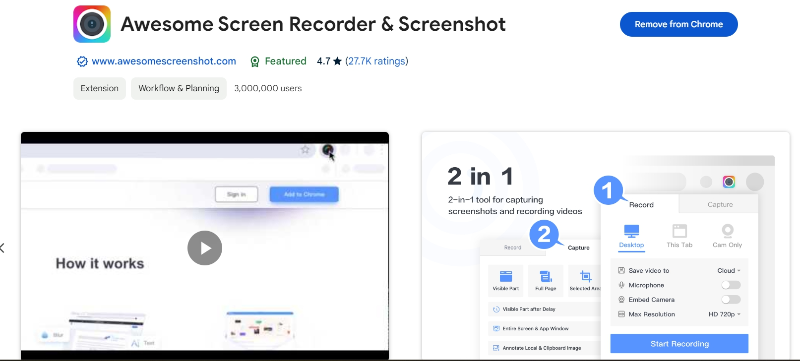 Awesome Screenshot는 웹페이지 화면의 스크린샷을 캡처하고 화면 녹화 할 수 있는 화면 캡처 및 화면 녹화 툴 크롬(Chrome) 확장 프로그램입니다.