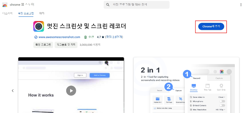 2. 검색 결과에서 Awesome Screenshot 확장 프로그램을 찾아 ‘Chrome에 추가’ 버튼을 클릭합니다.
