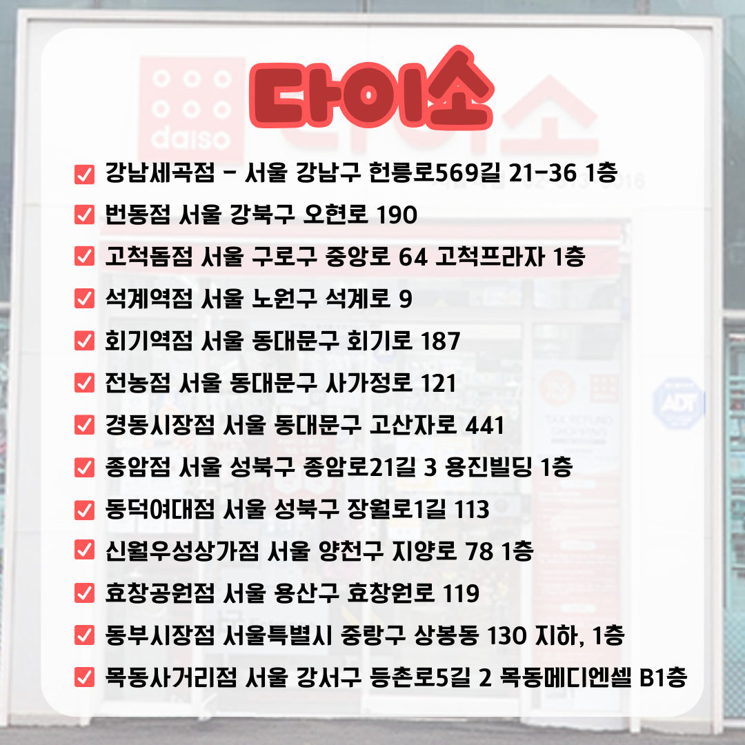 서울시 내 연매출 30억원 이하 다이소 가맹점 중심으로 소비 쿠폰을 사용 가능한 서울 다이소 매장 리스트