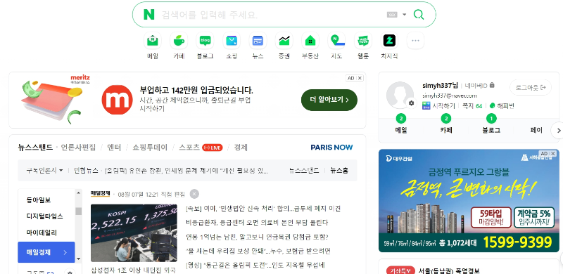 3. 웹사이트 스크린샷 캡처: 제작하려는 웹사이트의 레이아웃을 스크린샵으로 캡처합니다 (예시:네이버 메인 페이지 )